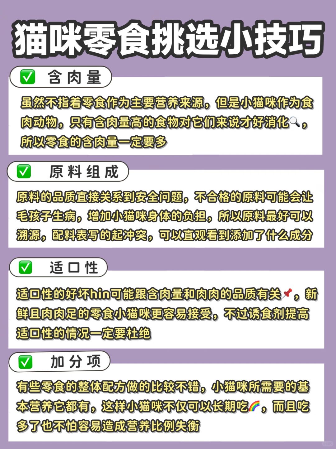 虽然不指着猫零食作为主要营养来源,但是小猫咪作为食肉动物,只有含肉量高的食物对它们来说才好消化🔍,所以猫零食的含肉量一定要多