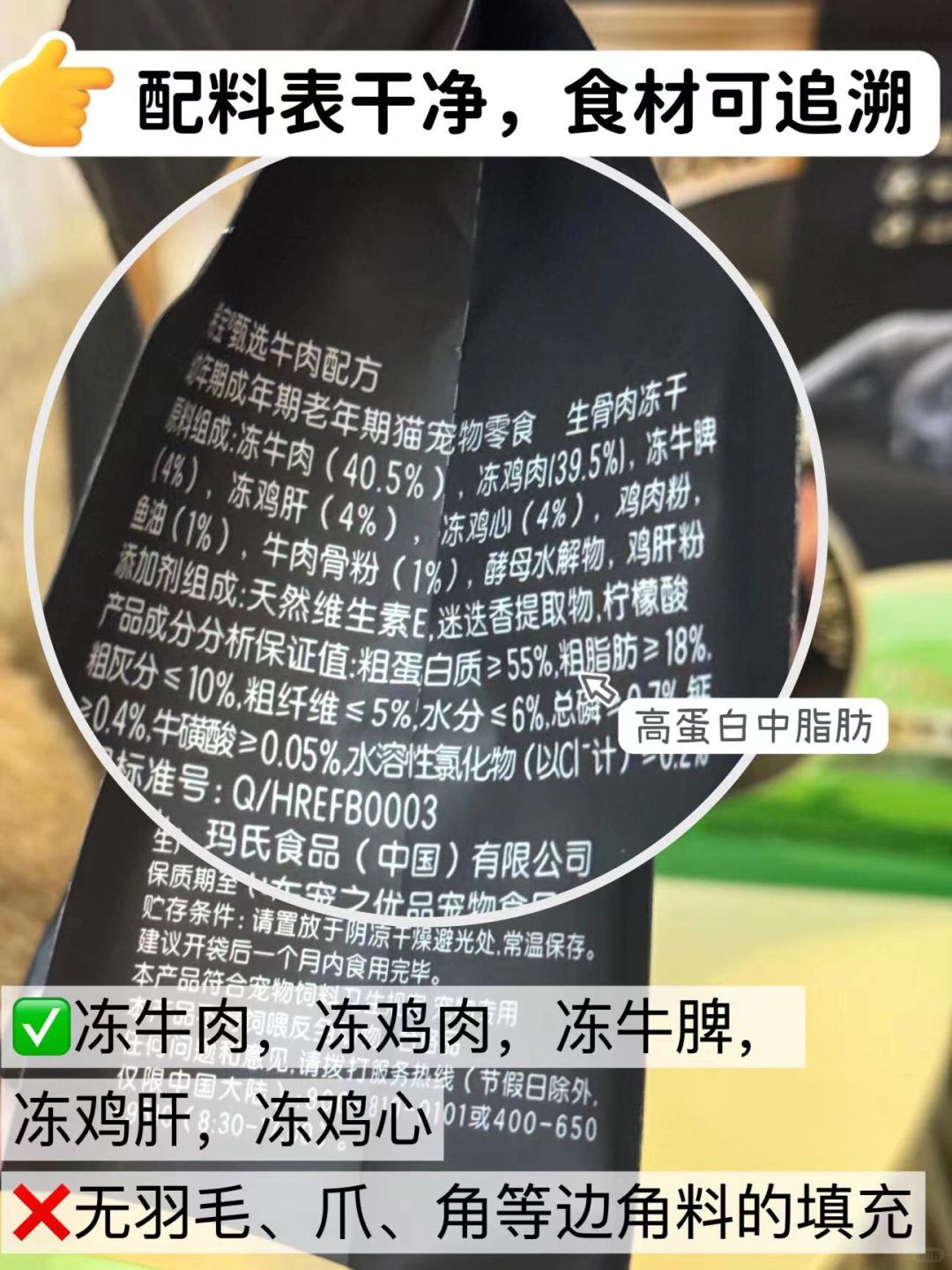 原料的品质直接关系到安全问题,不合格的原料可能会让毛孩子生病,增加小猫咪身体的负担,所以原料最好可以溯源,可以直观看到添加了什么成分📝