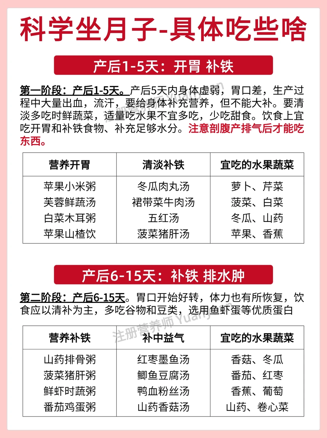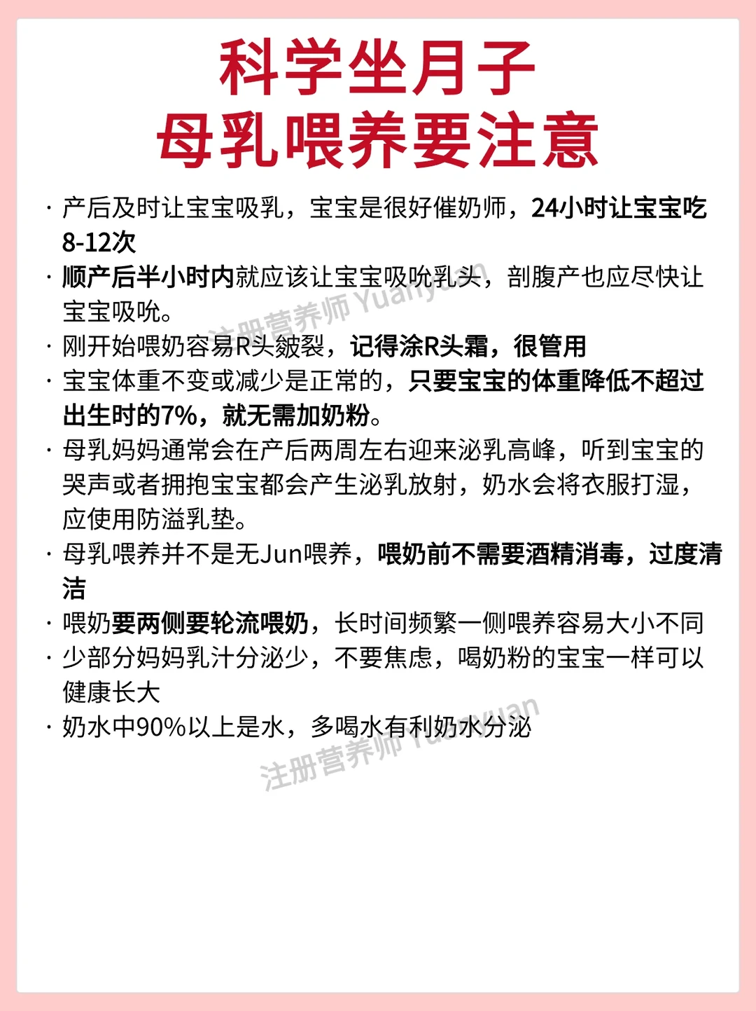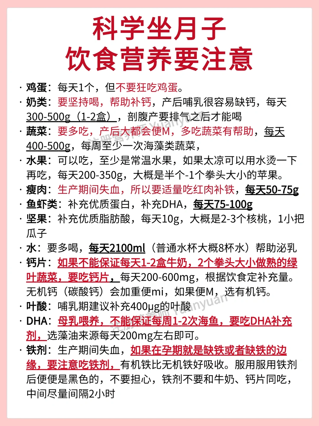 生完孩子,妈妈们的身体都会很虚弱。月子,也就是产褥期,在宝宝出生后胎盘娩出后,子宫的恢复期大概需要六周,所以做月子建议大家做满42天。 . 传统的月子禁忌有很多,但现在的生活环境和老一辈不一样,有些之前的禁忌现在不适用。比如,之前坐月子不能洗澡洗头,那是因为之前保暖设施不好,没有吹风机,空调,浴霸,风暖,洗澡很容易着凉,坐月子不洗澡是之前的一个更优选择,但是现在我们的生活条件可以达到保暖不着凉,为了卫生和更好的恢复洗澡是更好的选择。 . 整理的一些坐月子的注意事项,有需要可以保存 ✅月子饮食注意事项 ✅营养补充注意事项 ✅母乳喂养要点 ✅生活护理要点 ✅月子不同阶段饮食重点 ✅顺产,剖腹产一周食谱 具体内容详见上图。