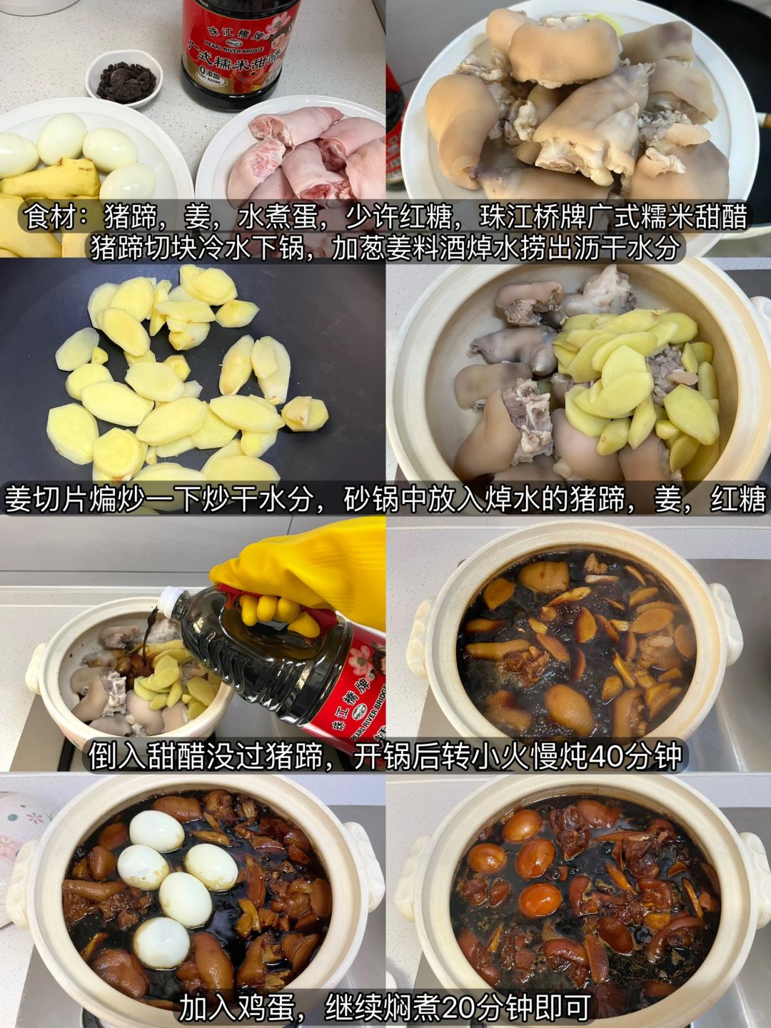 [种草R]这道菜看着好像很繁琐实则很简单,上手就会。需要提前准备好它的灵魂调料“珠江桥牌广式糯米甜醋”,广东老字号味道很正,配料也干净是0添加的一款甜醋,炖的时候不放糖不放水就能做出一锅正宗猪脚姜~今天炖的猪脚软糯q弹,配大米饭一绝~泡在醋汁里的鸡蛋也很入味,还有平时我们家里人喜欢的糖醋口味,用它调制出来的酱汁酸甜开胃,全家人都喜欢~