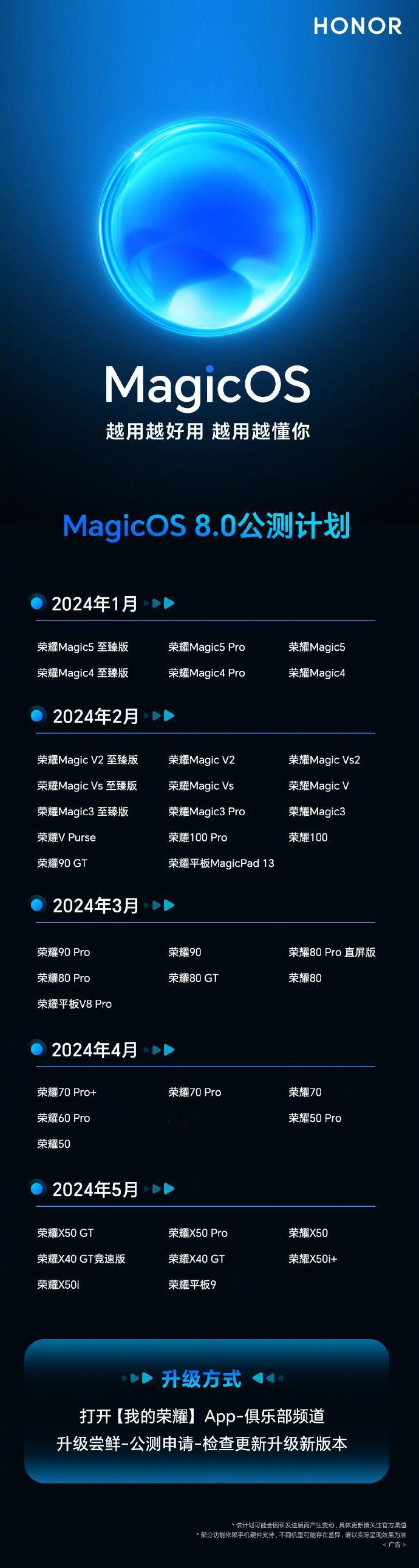 荣耀手机用户注意了,这里带来荣耀MagicOS 8.0的升级内容和公测时间。 荣耀魔法系统8.0 焕新升级!性能进化,全新流畅动效、重载并行不卡顿、存储空间压缩等性能提升带来更加丝滑流畅的操作体验;智慧进阶,全新桌面、全局收藏、任意门等新功能带来更加高效便捷的使用体验!还有更多功能,将在后续版本更新解锁,敬请期待! 当前,荣耀Magic4系列、荣耀Magic5系列已开启公测升级,这里给大家分享其他机型的升级计划,荣耀折叠屏系列、荣耀100系列、荣耀90 GT和荣耀魔法平板13都在2月公测,我正在使用的荣耀90 GT和旗舰机型、数字系列新机型同期升级,在使用过程中,这款手机堪称准旗舰,强大的性能、优秀的屏幕、齐全的配置、轻薄的体验综合起来可以说是水桶机型,作为一款线上机型非常能打,未来将会给大家分享更多的使用体验。 再看后面的公测,荣耀80、90系列都会在3月公测,荣耀60、70系列会在4月公测,最后一波公测是5月的荣耀X40、X50系列部分机型。看到你手机的公测时间了吗?