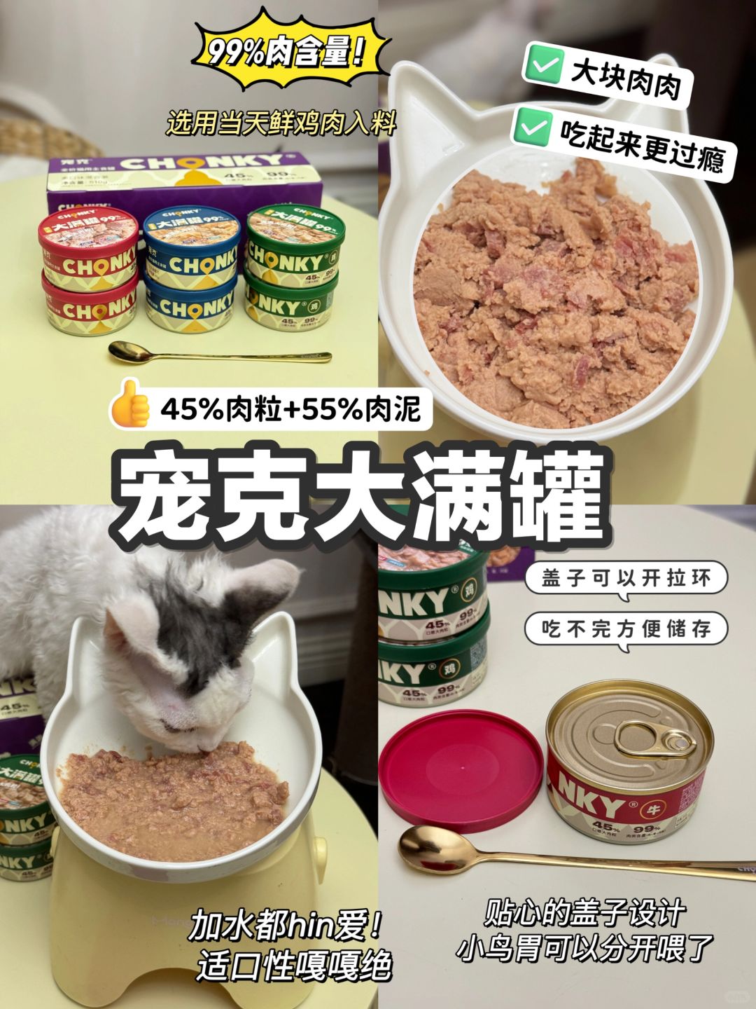 含肉量多,达到了99%,符合毛孩子的食肉胃,里面是45%大肉粒和55%的肉泥🥩,毛孩子吃起来口感丰富。当天鲜鸡肉入料新鲜,也没有谷物、淀粉、防腐剂之类的添加。盖子可以当开罐器,吃不完扣上还能密封宠克