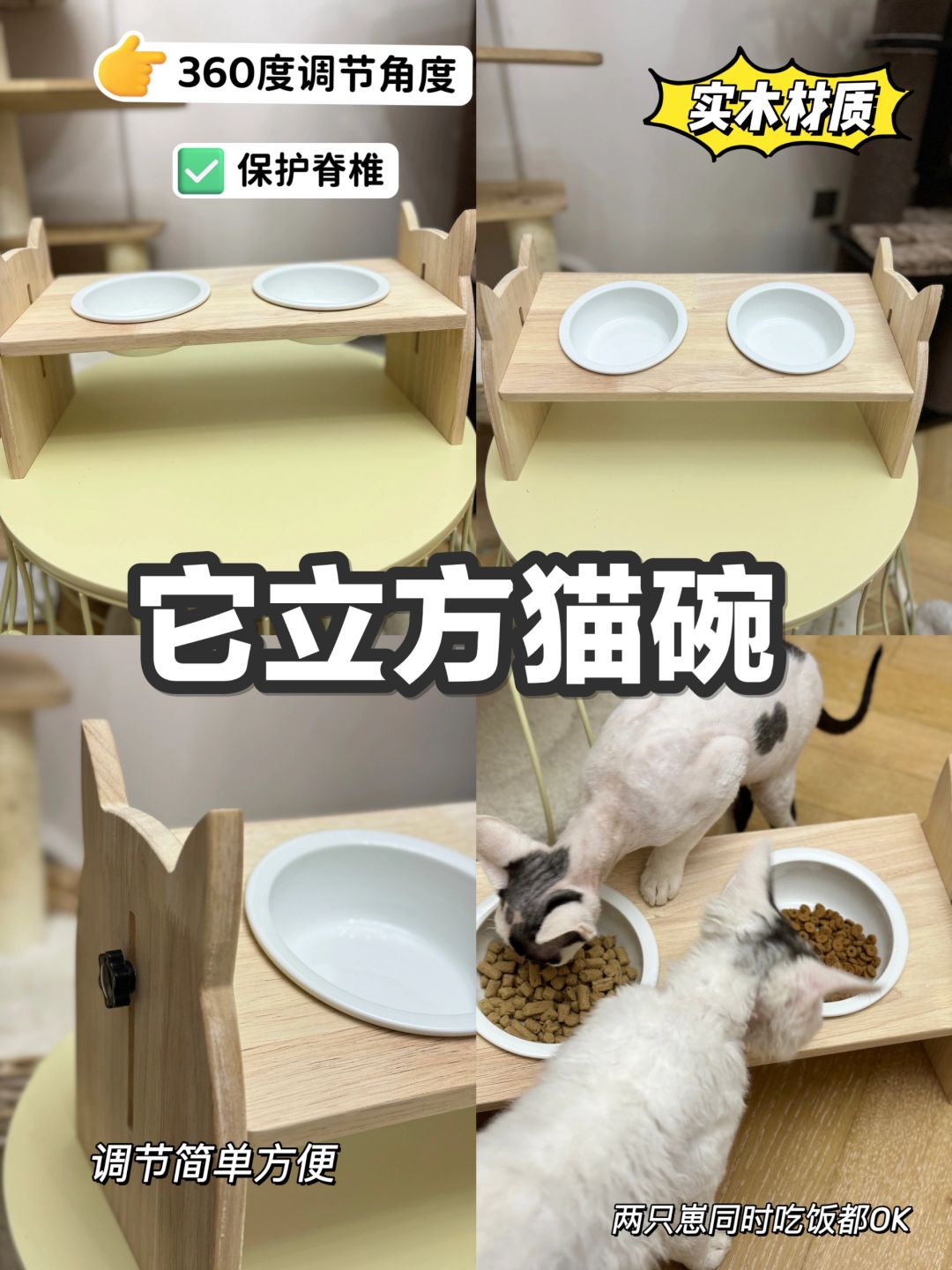倾斜程度是可以360度调节的,可以保护脊椎,高度也可以调整,预防黑下巴。碗架是全实木的,没有甲醛或者喷漆,安全又环保。整体防水✅,毛孩子吃饭弄脏了用抹布一擦就行,很好打理