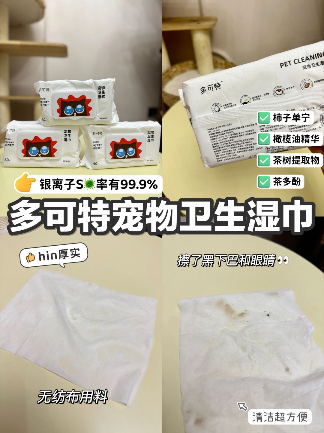 不仅有清洁作用,添加了银离子使S🦠率有99.9%的同时依然温和,柿子单宁、橄榄油精华、茶树提取物、茶多酚等成分可以滋润毛孩子的皮肤✨,秋冬用很不错。是无纺布的,不仅厚实,而且尺寸大,用起来很顺手多可特
