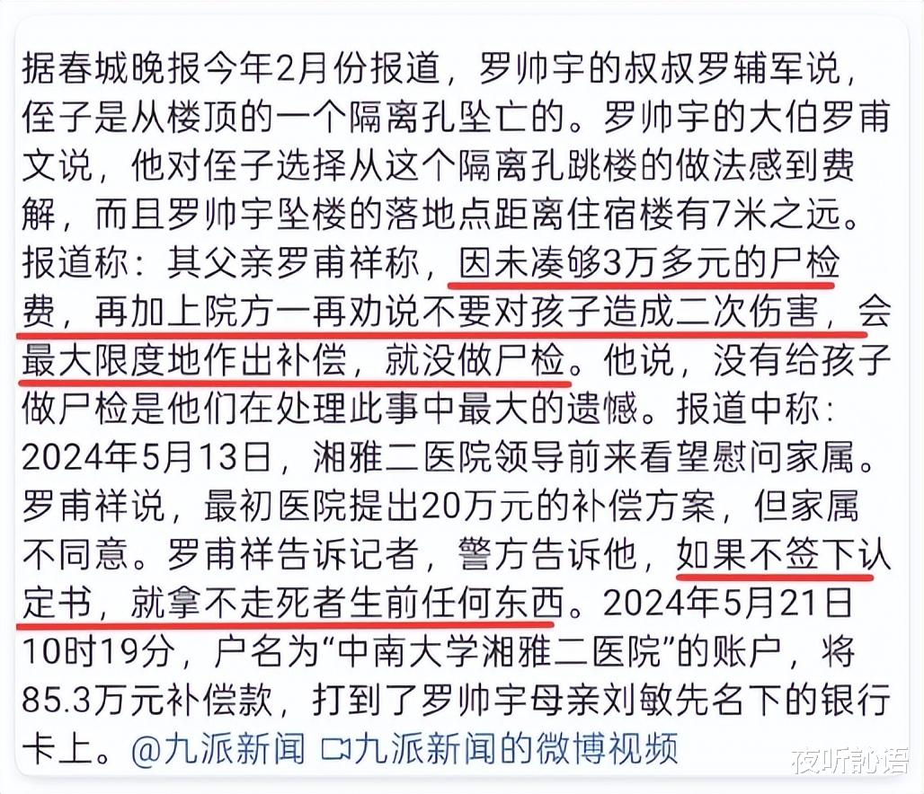主要内容是院方同意补偿包括丧葬费在内的所有费用共计85.3万元,但要求承认罗帅宇系自杀身亡的,家属不能在任何地方对外发声。
