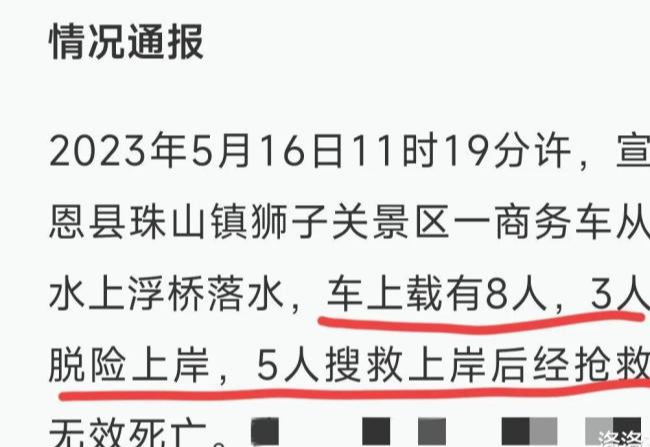 一辆9座的商务车在网红浮桥上行驶时,突然车轮发生侧滑,冲破护栏后沉入水中,车内共有8名游客,3人获救,5人溺亡。
