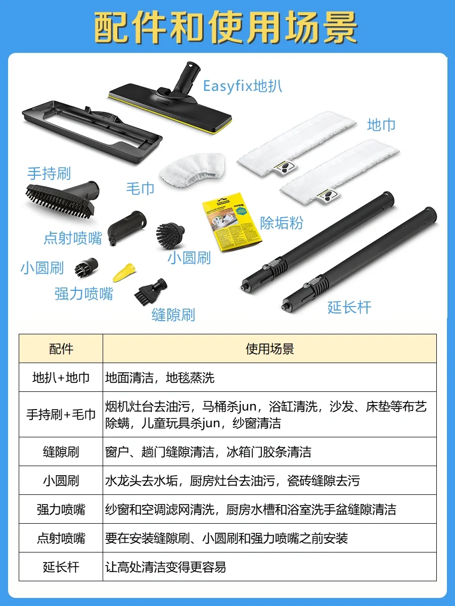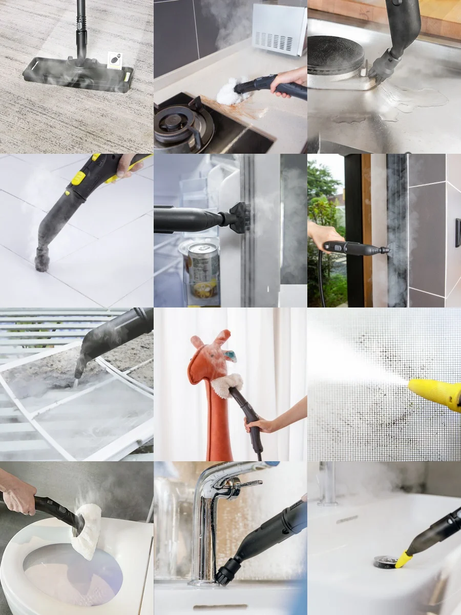 以上3款产品,搭配配件使用,✨一台机器=蒸汽拖把+厨房清洁器+玻璃清洁器+除螨仪+缝隙清洁刷