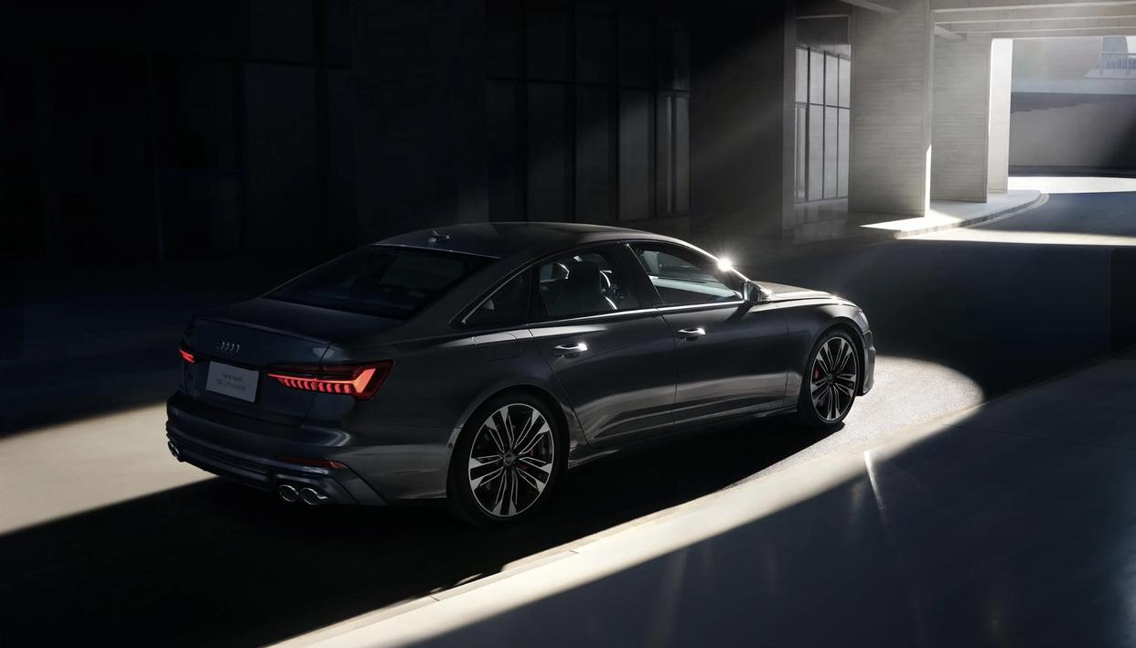 不得不说,全新的奥迪S6依旧很有辨识度,无论从哪个角度,让你一眼就能认出这是一台奥迪车型。整个车头造型十分饱满,弧面的前舱盖加入了左右对称的筋线,硕大的六边形黑色格栅搭配着蜂窝镂空式的黑色中网,两侧造型犀利的熏黑大灯内部融入了滴水涟漪样式的日行灯、高清矩阵式LED光源,拥有更高的分辨率,可为车辆夜间多场景行驶提供更精确的道路照明。配备了S-Line样式的碳纤维前包围带来了极强的视觉冲击力。车尾造型有些中庸,尾箱自然延伸出的扁平化小鸭尾,搭配着黑色的碳纤维材质的底部扩散器和双边四出的炮筒式排气,增添了更多的运动气息。两侧熏黑的尾灯内部融入了第二代OLED技术,内部配备悬浮式灯组模块,科技感十足。