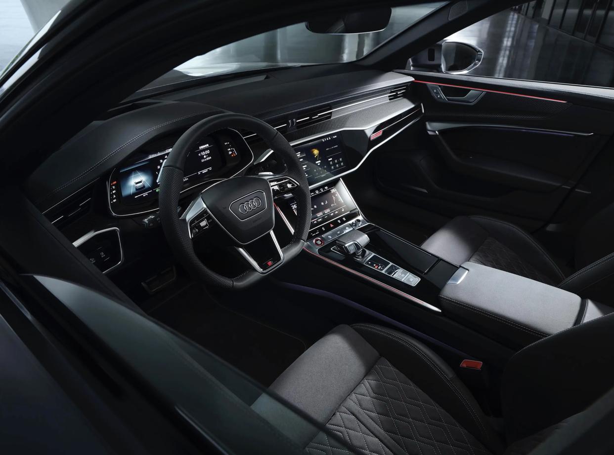 进入车内,作为中期改款的奥迪S6座舱布局没有明显变化,配备了奥迪运动座椅,采用Dinamica与真皮组合面料,并配有S line徽标与菱形缝线装饰,千帕座椅支持加热;后排的沙发座椅可以按比例放倒。环抱式的座舱采用了大面积Alcantara面料、华格纳真皮座椅面料(带S标识)的交替铺陈,还有银色镀铬装饰以及碳纤维装饰面板,手感更加柔软,触感也更加高级。奥迪的虚拟座舱配备了12.3英寸液晶仪表、14.5英寸中控屏、副驾前将配备10.9英寸娱乐屏、10.1英寸MMI显示屏、下方8.6英寸中央触摸显示屏以及HUD平视显示。得益于MIB 3硬件系统,使得CPU中央处理性能得到了大幅提升,操作更加流畅。操控性方面,该车配备了平顶平底的多功能方向盘,左右两侧功能区采用了新一代的背光触控式设计和大尺寸换挡拨片,操控岛加入了符合人体工学的换挡机构。