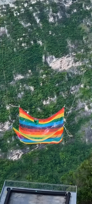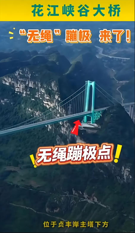 贵州花江峡谷大桥凭借625米的桥面至水面垂直高度,摘下“世界第一高桥”桂冠。景区原计划借此打造中国首个商业化“无绳蹦极”项目:体验者不系任何绳索,从跳台纵身跃下,以自由落体姿态坠入一张面积约160平方米的巨型安全网中,网体四角固定,触网后再降至平台离开。这一创新设计标价1699元/次,远低于该桥传统有绳蹦极的2999元,意图以惊险度和性价比掀起极限运动新浪潮。