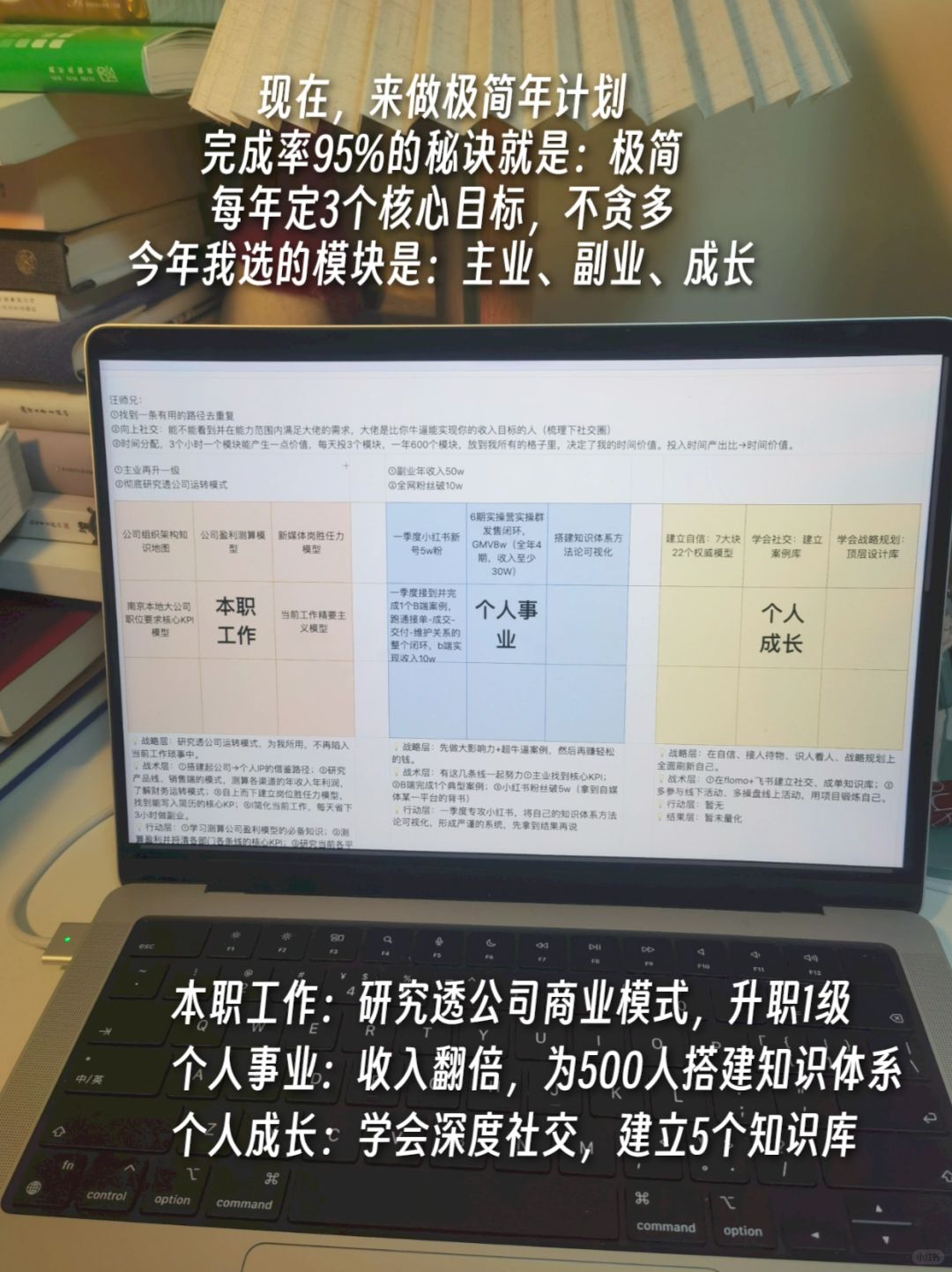 年初制定的年度计划,完成率 95%:主业上接手了新的业务,副业收入即将破 6 位数,缓和了跟父母的关系,小家庭感情越来越好,查出了身体有毛病但是心态很积极,跟朋友同事的关系也很好。
