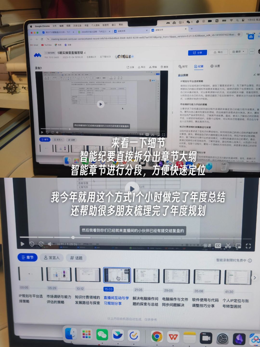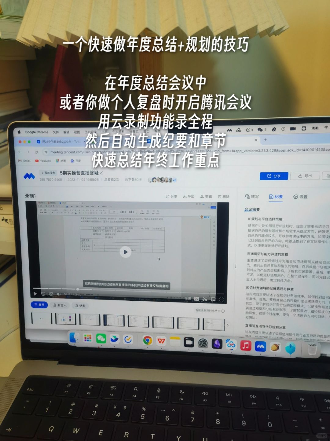 腾讯会议智能录制:在年度总结会议中,或者你做个人复盘时开启腾讯会议,用智能录制功能录全程,然后自动生成纪要和章节,快速总结年终工作重点。