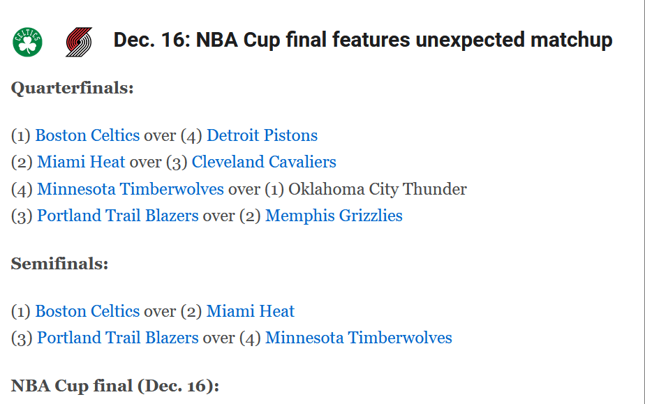 凯尔特人(1号种子)击败热火(2号种子);开拓者(3号种子)淘汰森林狼(4号种子)