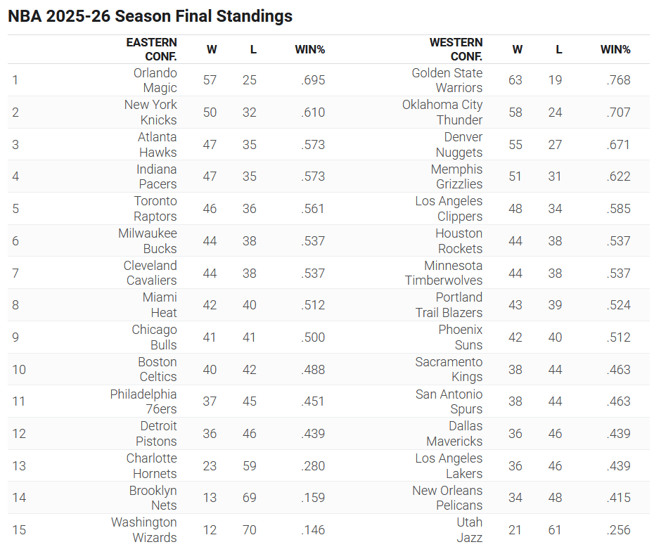 魔术 57-25;尼克斯 50-32;老鹰 47-35;步行者 47-35;猛龙 46-36;