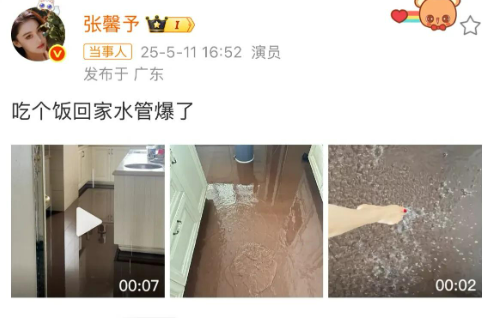 家人们,张馨予最近碰上大麻烦了!母亲节那天,她开开心心出去吃顿饭,结果回家直接懵圈,家里的水管爆了,那水跟不要钱似的,从天花板疯狂往下灌,家里直接秒变“水帘洞”,地板上全是积水,场景简直“惨不忍睹”。