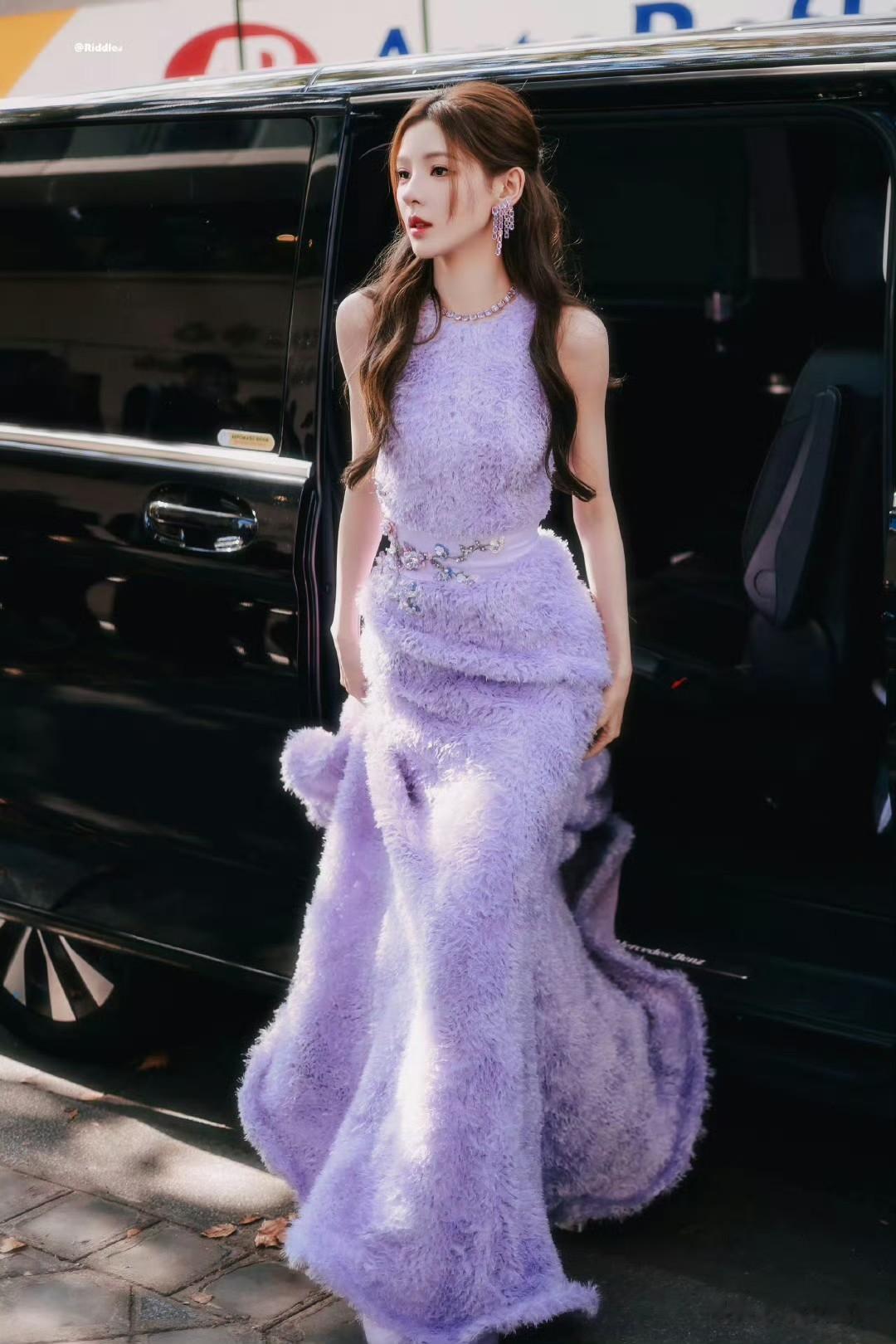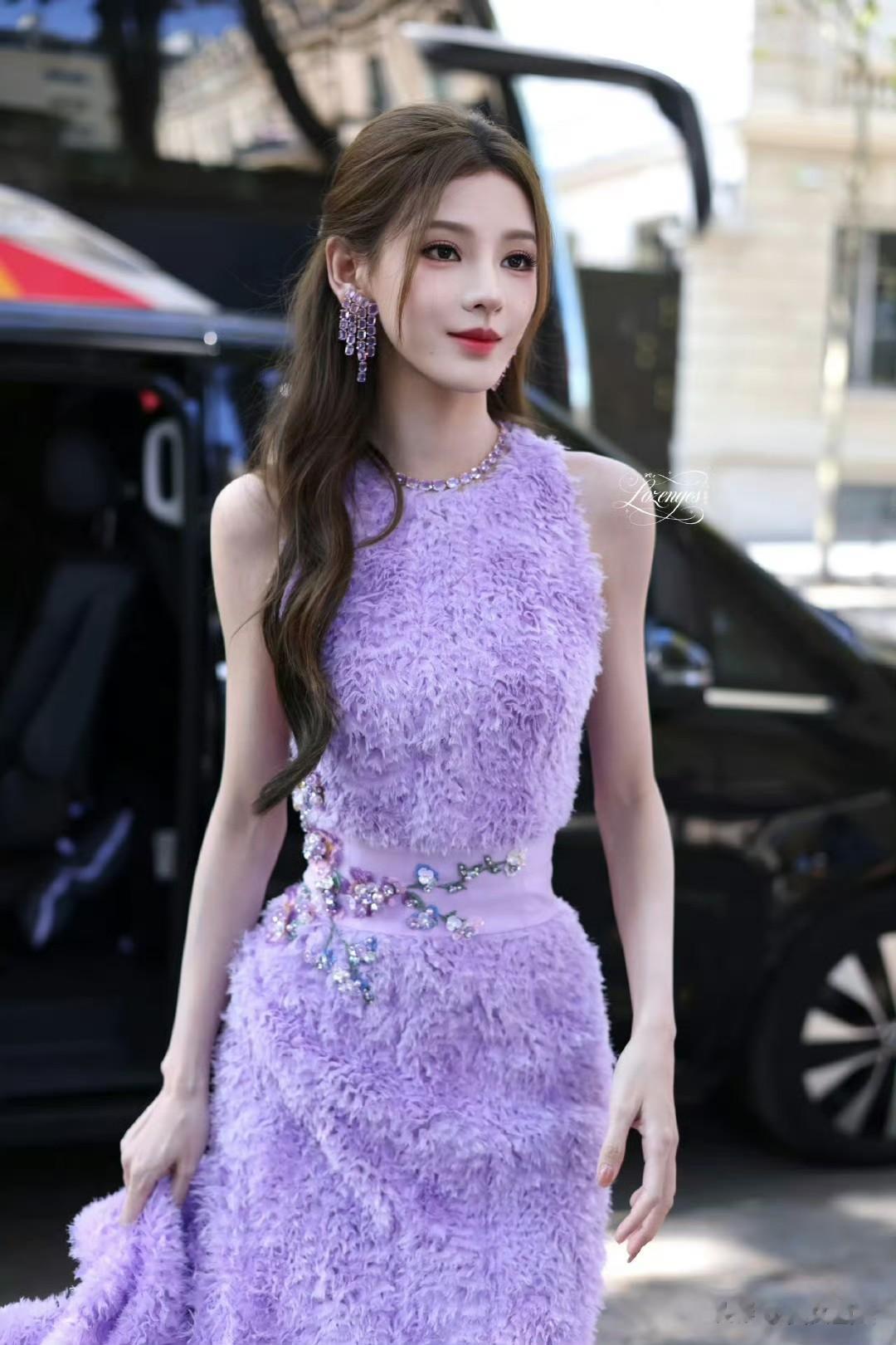 张予曦这次出国参加巴黎时装周,简直美出了新高度,说她浑身散发着紫罗兰气息一点不为过。她穿的LA KORADIOR梦幻紫无袖花朵长裙,和她的冷白皮相得益彰,再配上施华洛世奇珠宝,整个人清丽又精致。