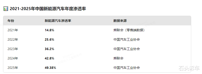 一个行业最重要的不是看保有数量,而是增长率,新能源车渗透率不断攀升,2021年是14.8%,2022年是25.6%,2023年是36.2%,2024年是42.8%,2025年是49.38%。
