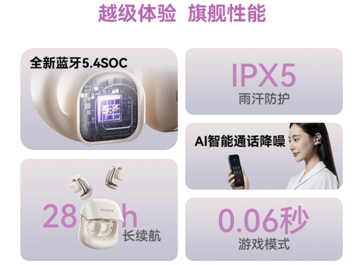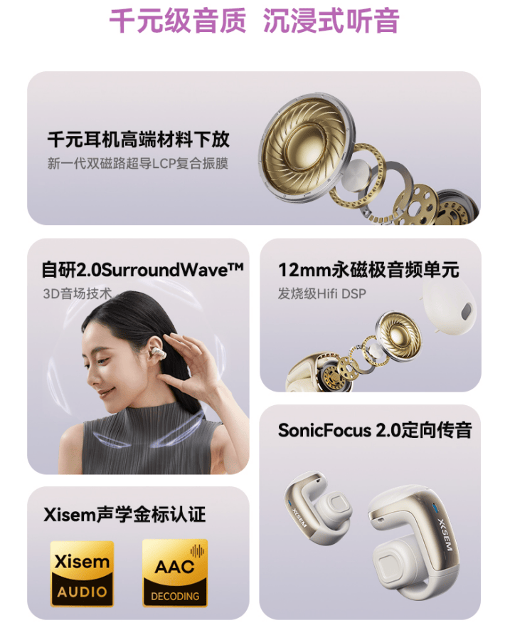 此外,Plume配备SonicFocus 2.0定向传音技术,通过精准定向和泄漏抑制设计,将声束控制在28°内,减少95%漏音,让开放式耳夹佩戴也能私享音乐,同时降低对周围环境的干扰。每一项声学设计都经过 Xisem 声学金标认证 严苛验证,从腔体结构、振膜到驱动单元,确保声音稳定、纯净且充满临场感。