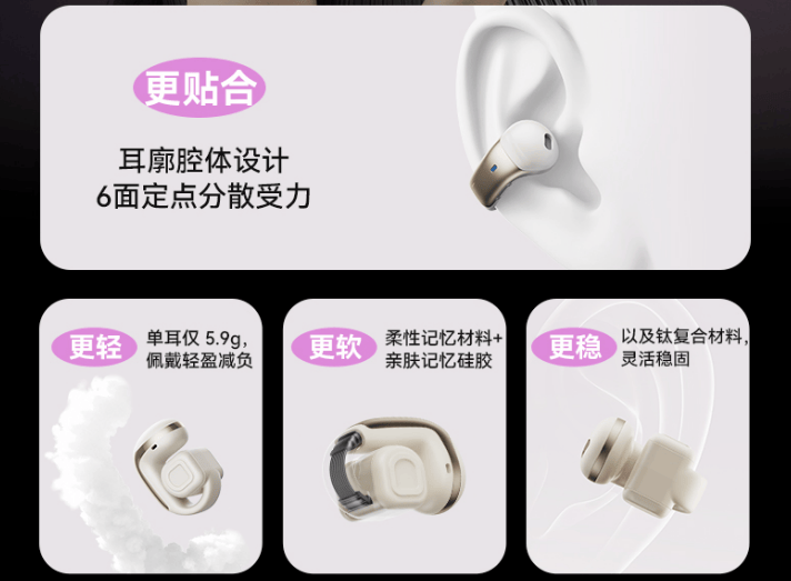 西圣Plume在佩戴舒适度上实现了全面升级。它采用TriSix三轴六点分力结构,将耳机受力精确分布于耳廓六个关键位置,形成三轴稳定支撑架构。每一个佩戴角度都能精准分担压力,实现动态自适应贴合,让耳机稳固不滑落,同时有效减轻耳部负担,彻底消除夹耳感和异物感。