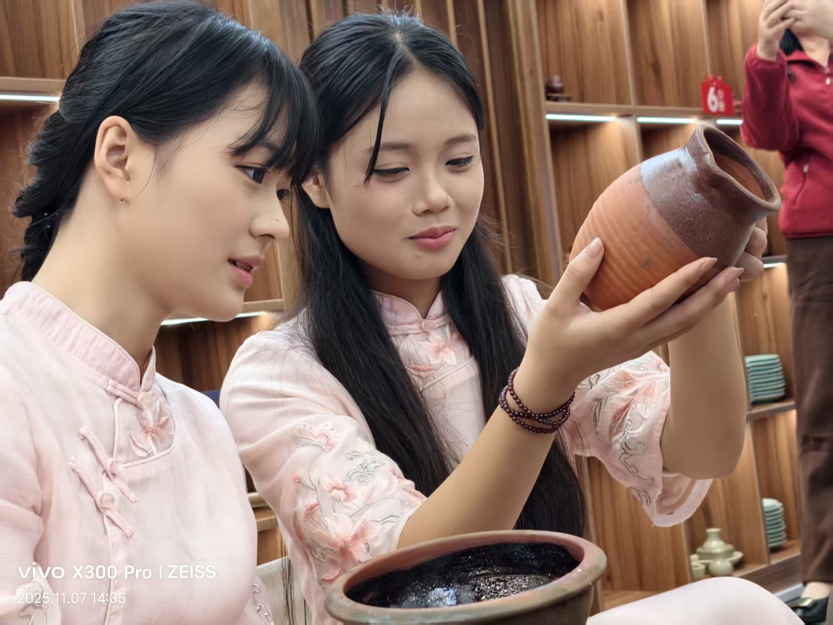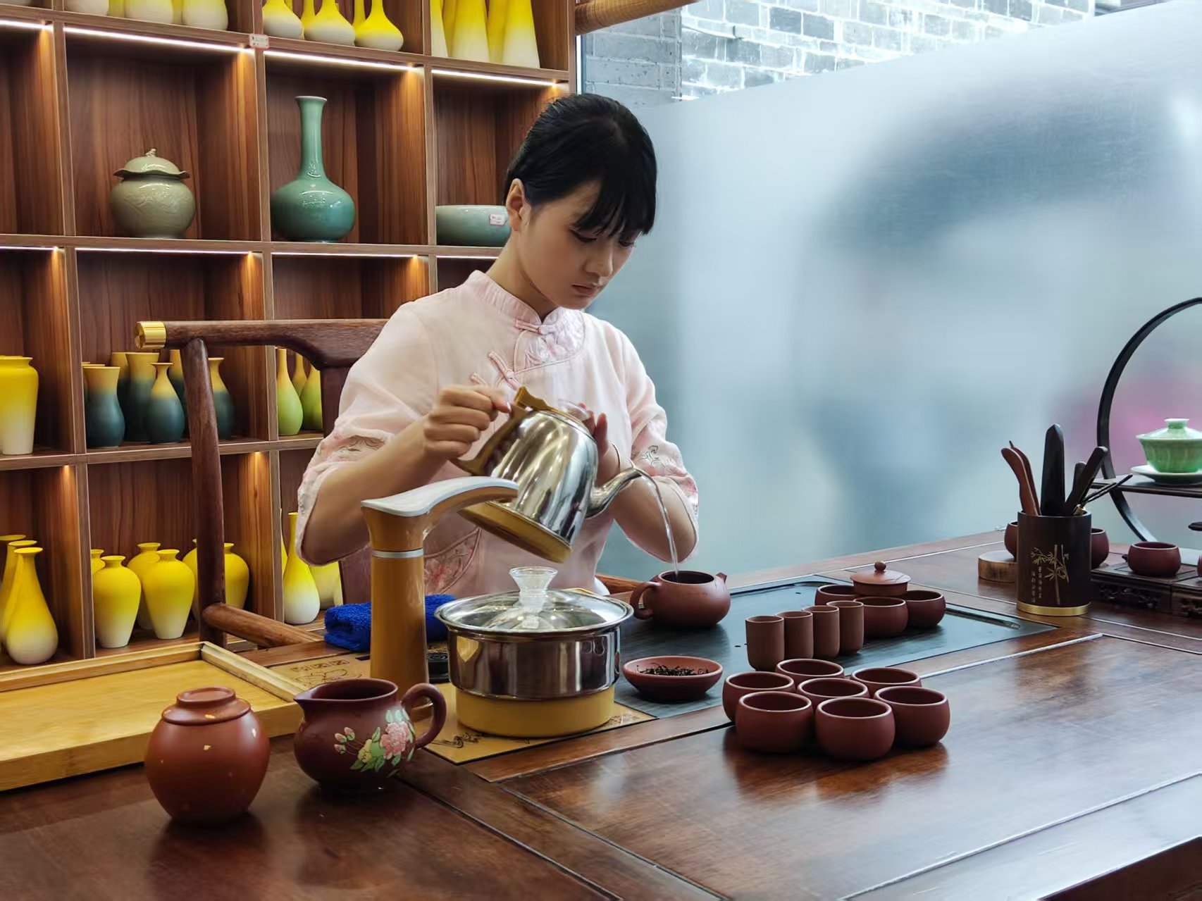学员们纷纷举起手机,将心仪的陶器定格于镜头之中。茶艺师表演了优雅动人的茶道。最令人倾心的,是那些柴烧红陶茶器——壶与杯皆不上釉、不雕琢,全凭窑火在坯体上烙下飞灰的痕迹,宛若火与土的对话,染就朝霞般的颜色。它们静默等待,等待一个茶香氤氲的午后,等待清水注入时那一声满足的轻叹。美,不可言传。