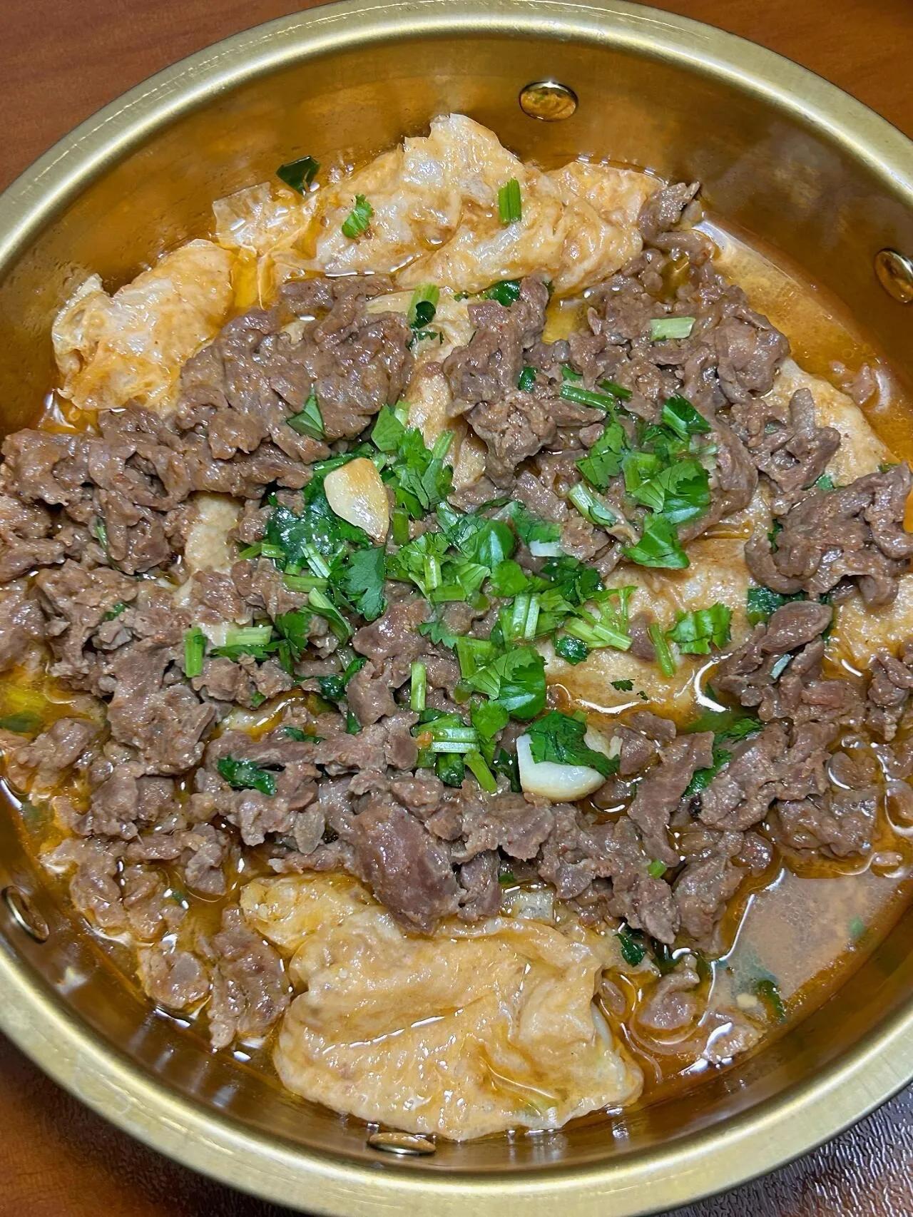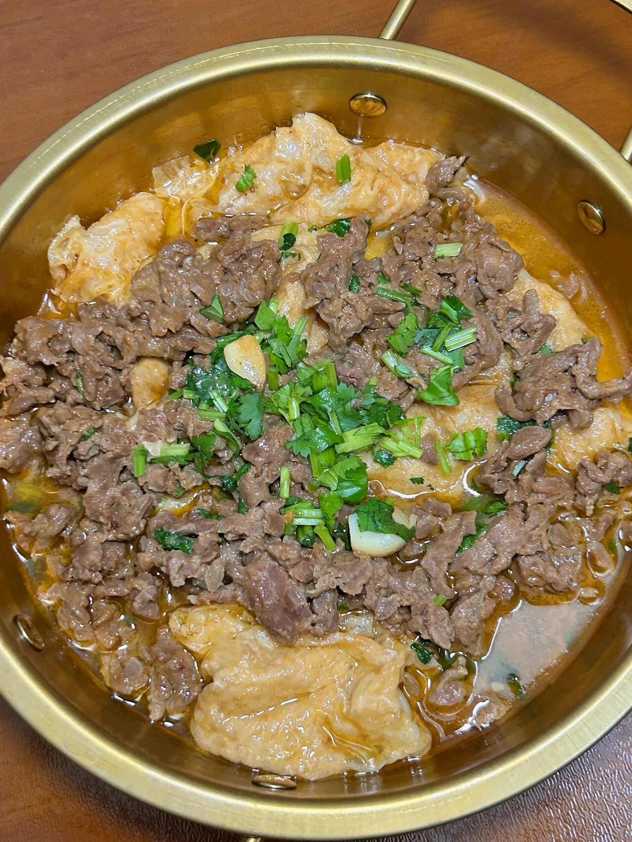 当这道香气扑鼻的豆皮卷端上桌,女儿迫不及待用筷子戳开酥脆的外皮,看着牛肉汁流出来,她兴奋地喊:"火山爆发啦!"看着她把豆皮碎和牛肉拌进米饭里,吃得满嘴油光的样子,我想起第一次在潮汕餐馆吃到这道菜的情景——金黄的豆皮裹着鲜嫩牛肉,沙茶酱的香气直冲鼻尖,那是我记忆中最鲜美的味道。