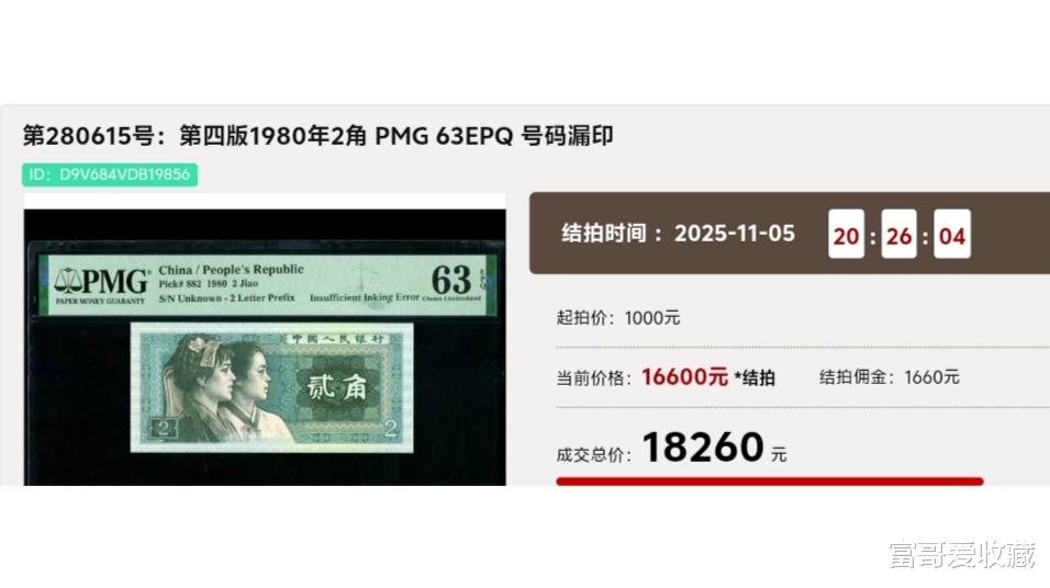 在2025年11月5日的“春秋大拍”中,一张1980年的“2角纸币”(号码漏印),其PMG评级63分,最后却拍出了18260元。