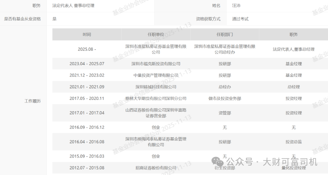 从汪沛的履历来看,也算是私募圈的跨界玩家。早年,他从招商证券衍生投资部的量化投资经理起步,之后辗转山西证券、格林大华期货,从投资经理做到投资总监。后来,他又在中量投资产和福克斯投资相继当基金经理。