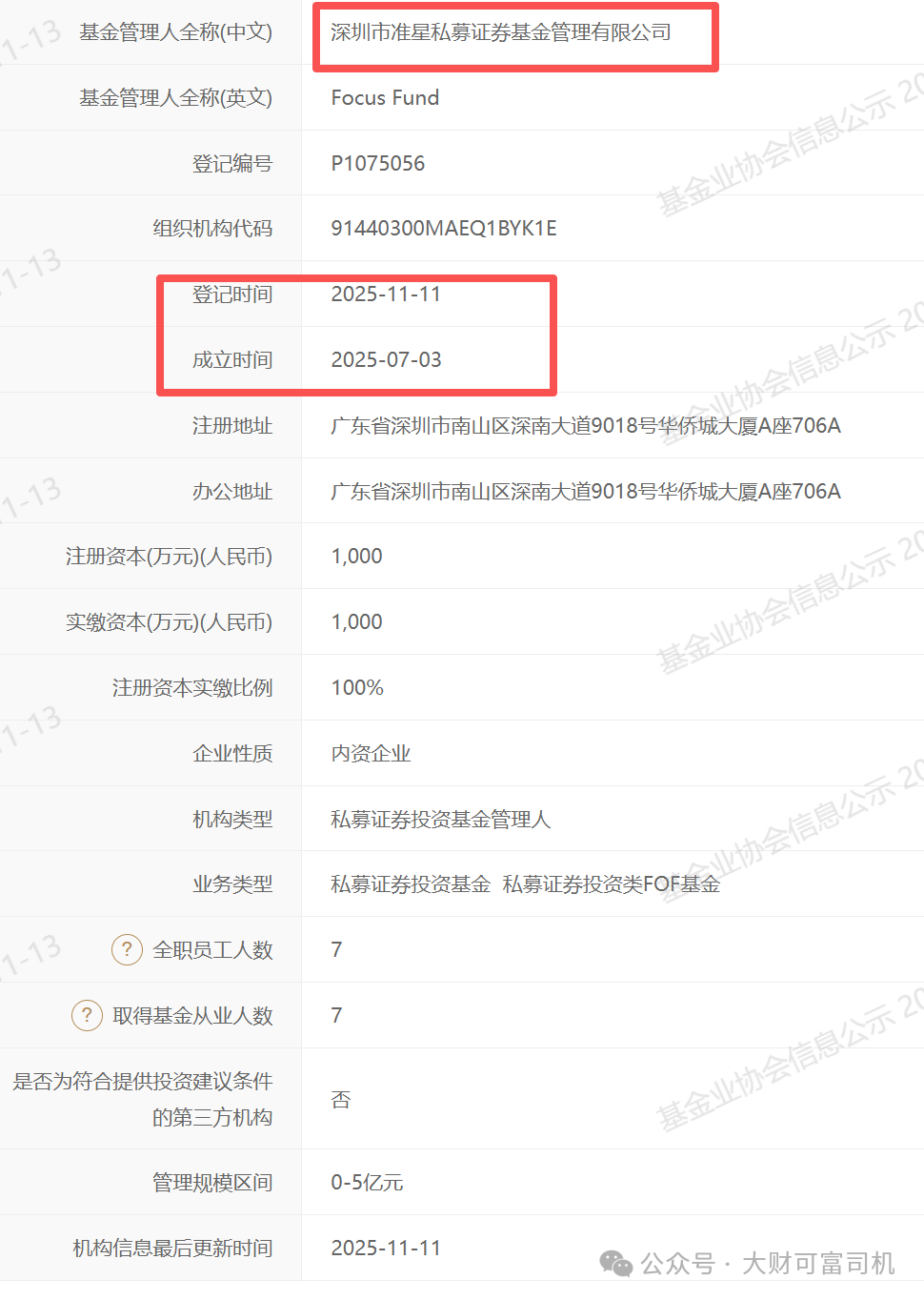 准星私募早在今年7月3日就已经成立,实缴资本1000万元。公司现有7名全职员工,注册地和办公地都在深圳南山区。看来这位曾经的 “量化腹肌男”,这次是真准备在私募圈大干一场了!
