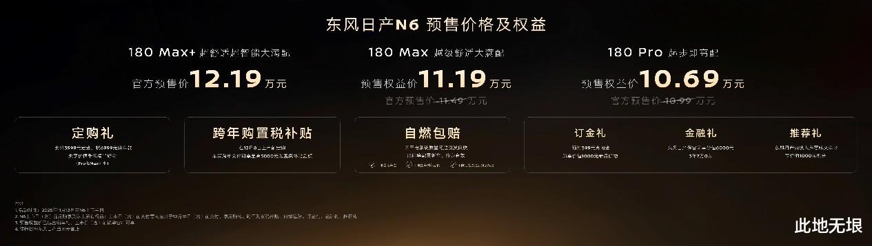11月13日,东风日产在广州举办“NI好,N6”技术暨预售发布会,N6推180Pro、180Max、180Max+三个版本,全系标配“20度以上大电池+180公里纯电续航”,官方预售价10.99万元-12.19万元。N6与N7同源,均诞生于全栈自研天演架构,被称为“插混版N7”,叠加预售权益后起售价下探至10.69万元,价格直接切入主流家庭购车预算核心区间,并计划于12月8日同步完成上市与交付。
