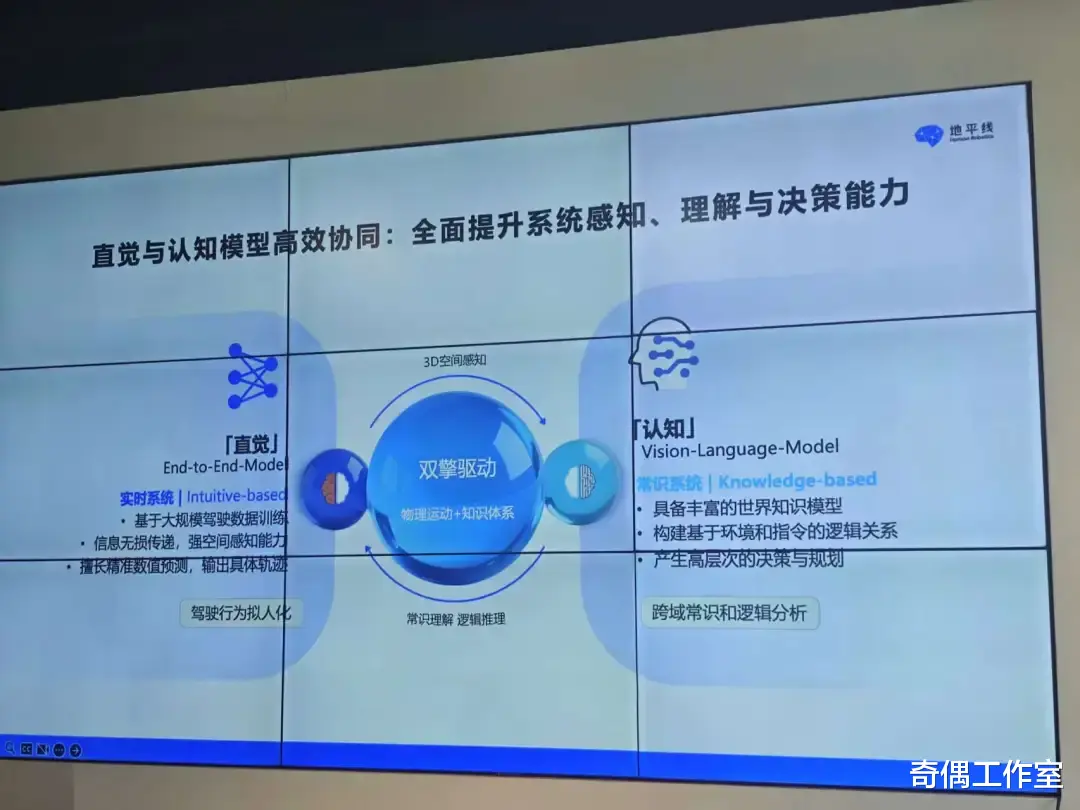 大家可以把一段式的端到端当成一个直觉系统,因为它本身是基于模仿学习来做,这种好处就像我们人开车一样,95%甚至98%以上的时间开车是很轻松的,因为你其实不需要大量的计算来去做这件事,没有消耗很多的能量而是靠直觉,这个其实是驾驶的基础。