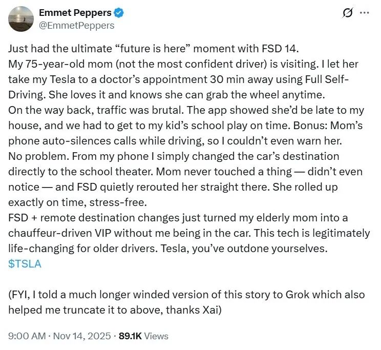 于是网友远程更改了妈妈的目的地,在妈妈没反应过来之前,FSD就准时把她送到了学校去看孙子演出。