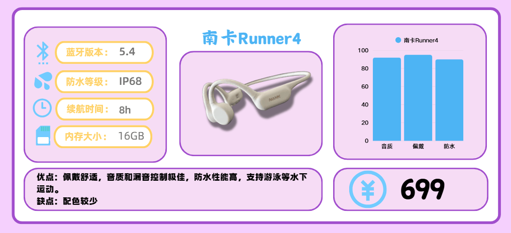 Runner4搭载南卡自主研发的高性能骨传导振子,显著增强低频表现,使整体音质层次感更强,听感更加清晰饱满。无论是节奏感十足的运动音乐,还是清晰的语音播报,都能提供媲美高端耳机的音质表现。相较同级产品,Runner4的音质处于领先地位,堪称“百元级耳机,千元级音质”,为运动爱好者带来高端的音频体验。出色的音质表现、舒适的佩戴感受和顶级防水能力,使得Runner4成为百元档最值得入手的骨传导耳机之一!凭借出色的音质表现、舒适的佩戴感受与顶级防水能力,Runner4赢得了广大运动爱好者的一致认可,是百元档最值得入手的骨传导耳机之一!