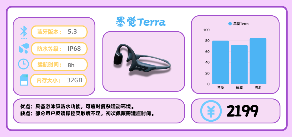 墨觉作为骨传导耳机品牌,Terra 采用 双磁路振子设计,结合 IP68 防水等级,在运动适配性和耐用性上表现突出。无论是跑步、骑行还是游泳,都能保持较高的稳定性,是偏向实用型的骨传导选择。