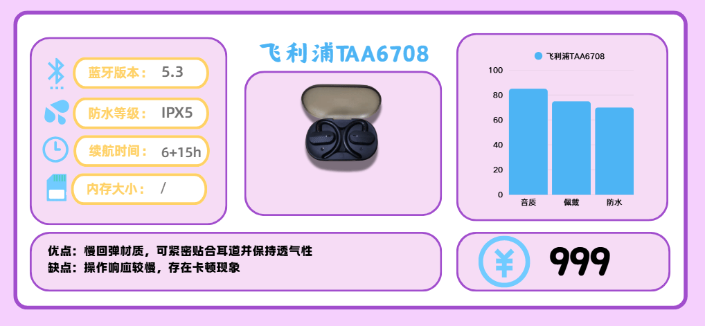 飞利浦 TAA6708 是一款主打 开放式设计 的运动蓝牙耳机,适合跑步、健身和通勤使用。它搭载 定向声学技术 和 14.2mm 动圈单元,在保持外界环境感知的同时,依然能带来有力的低频和清晰的人声表现。整体调校偏向自然风格,既能沉浸在音乐中,又能兼顾户外运动时的安全性。