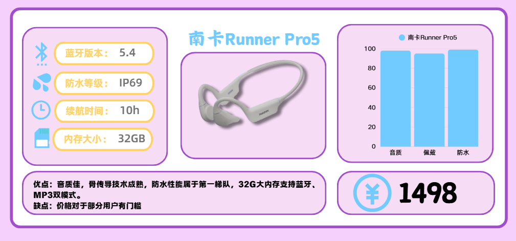 南卡 Runner Pro5 被超过 200家权威媒体 评为“遥遥领先的骨传导旗舰耳机”,稳居行业顶端。作为公认的 “不伤耳”骨传导鼻祖,南卡凭借深厚的声学研发实力,在业内率先推出 35°可调节灵动双形态设计,搭配 IP69级防水 与 第4代響科技专利技术,在音质、防水与舒适度三方面实现突破。该系列更获 世界冠军傅园慧、孙杨 等专业运动员力荐,实力与口碑双在线。