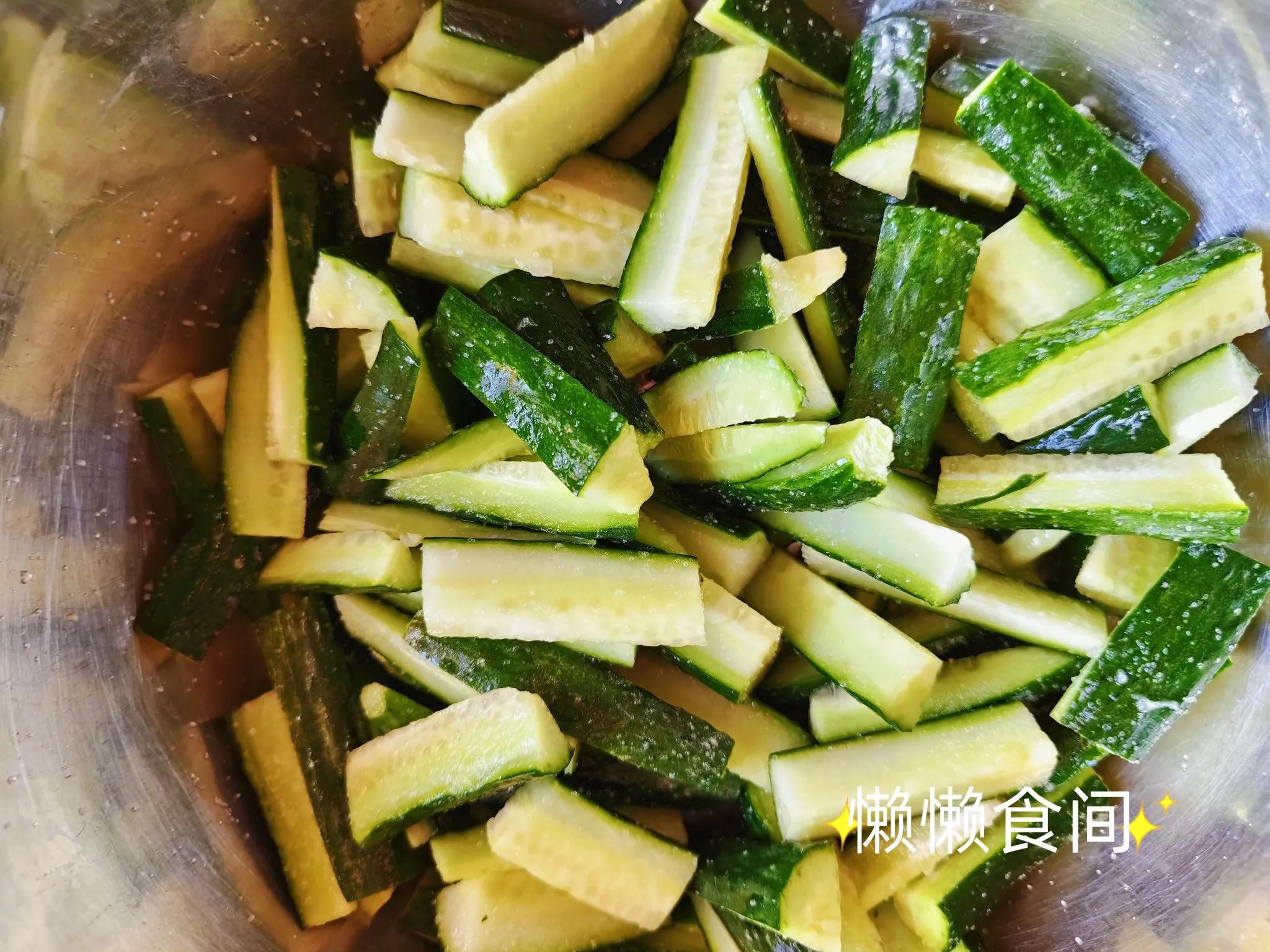 1、黄瓜洗净,切成小段,将切好的黄瓜段放入盆中,加入盐搅拌均匀,腌制半个小时左右。