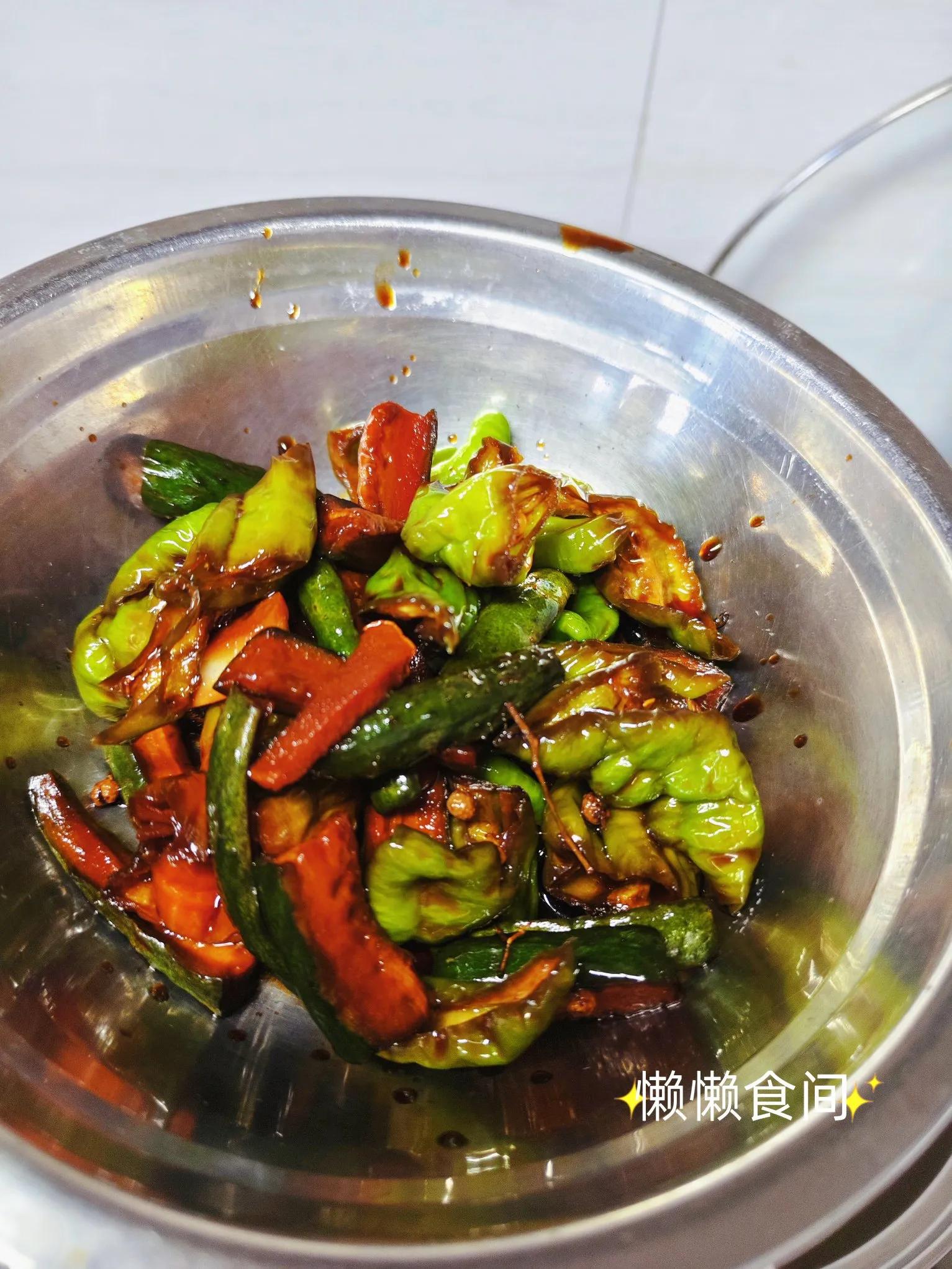 如果想放的时间更长一点,黄瓜可以用纱布包起挤出水分,辣椒也一块用盐腌制一下,控干水分。