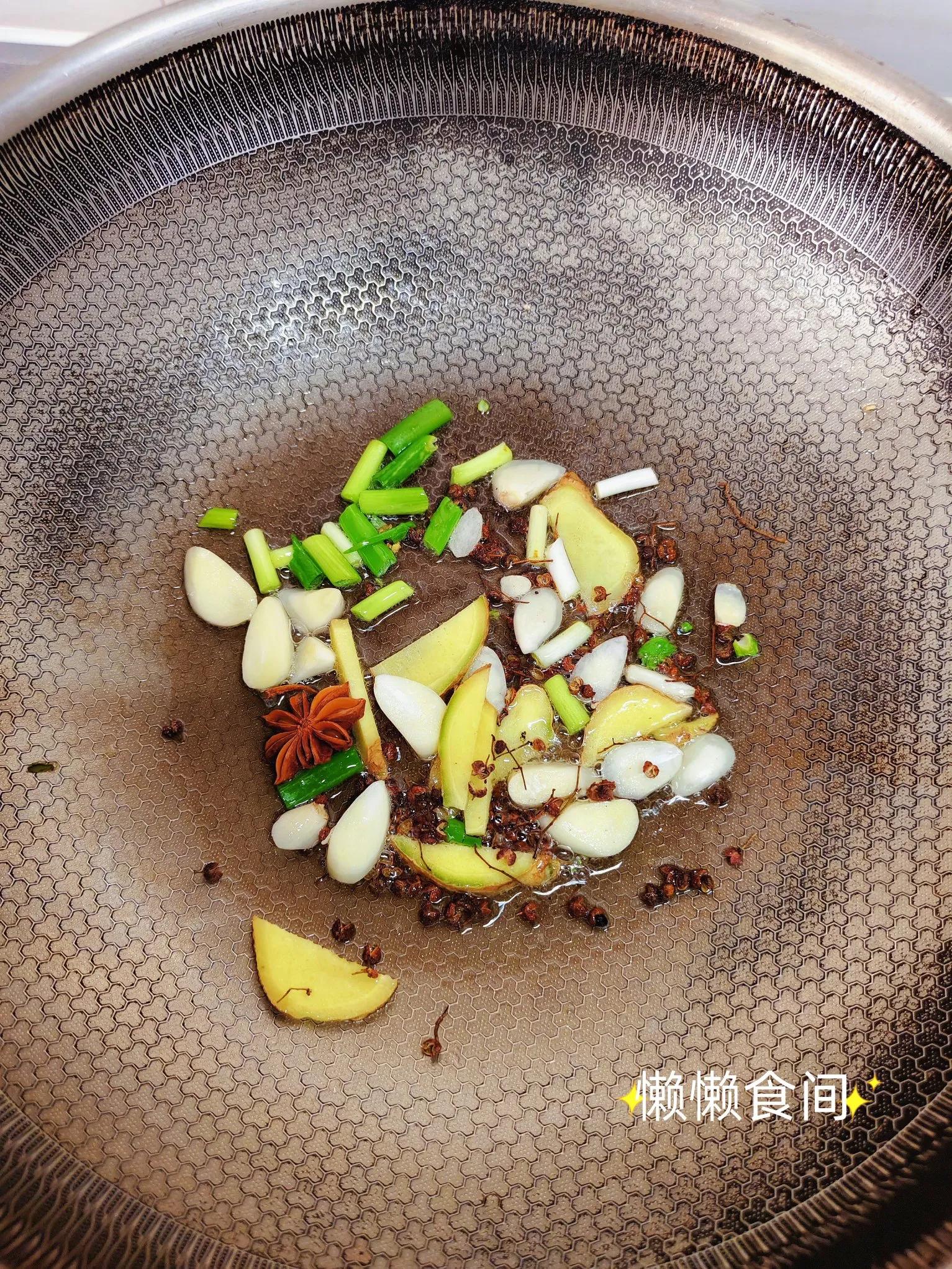 3、锅里倒入食用油,油热加入葱花、姜片、花椒、八角、蒜片,翻炒出香味。