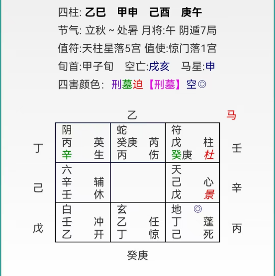 兑宫临景门(门迫)、天心星、九天,己+戊「犬遇青龙」格局。