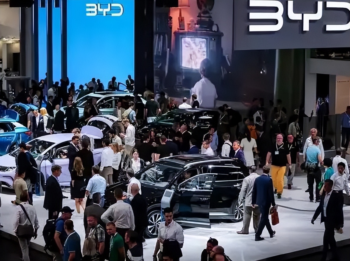 外国人参观中国汽车品牌比亚迪的电动汽车