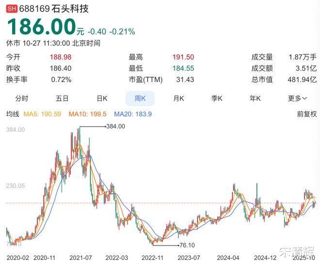 截至2025年10月27日午间休市,石头科技股价为186元/股,较2021年1494.99元/股的历史最高点,跌幅超过87%,市值蒸发近600亿。