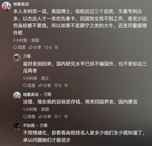 其实何止韩国如此,其他国家也出现了类似的情况,有个网友说:本人本科双一流,美国博士,母校出过三个总统,文章专利众多,以杰出人才一类优先拿卡,回国完全找不到工作,连老少边穷高校都不要我。所以如果不是颜宁之类的大牛,还是尽量留海外吧!