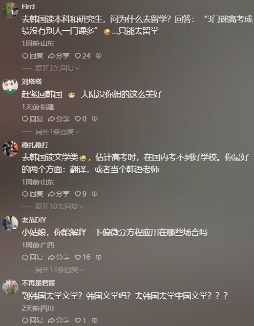 有网友对此评论:学渣出国混个文凭回来骗人的时代一去不复返了!其实这就是网友们朴素的印象。因为去韩国上本科的话,笔者所知,去韩国水本科的,基本在国内高中都考不上,花钱上了个国际班,直接大学去韩国,这种情况特别多。当然去东南亚的更多。这也是为啥有网友说:当年在东北高考没过本科线的都去韩国了,80后都懂!