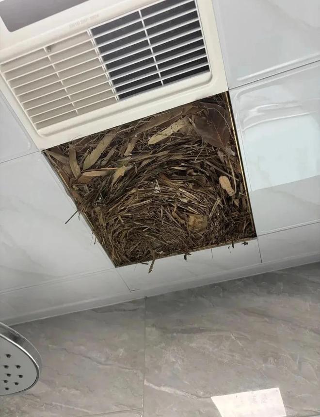 很多业主家里这个位置没有加装防鸟儿、老鼠罩子,就出现了小鸟从这里进来,在卫生间棚顶上做窝,甚至是生了一窝又一窝的小鸟儿,影响到日常生活。
