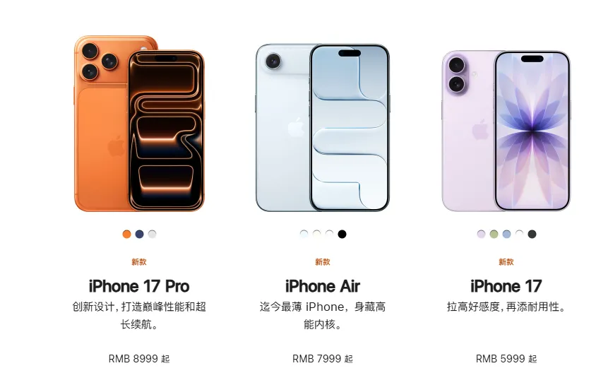 3、iPhone 17 Pro:256GB 为 8999 元,512GB 为 10999 元,1TB 为 12999 元。9 月 12 日晚 8 点接受预购,9 月 19 日发售。