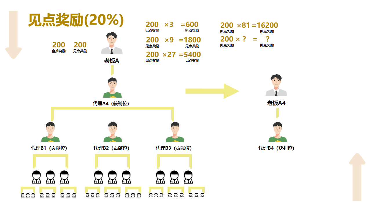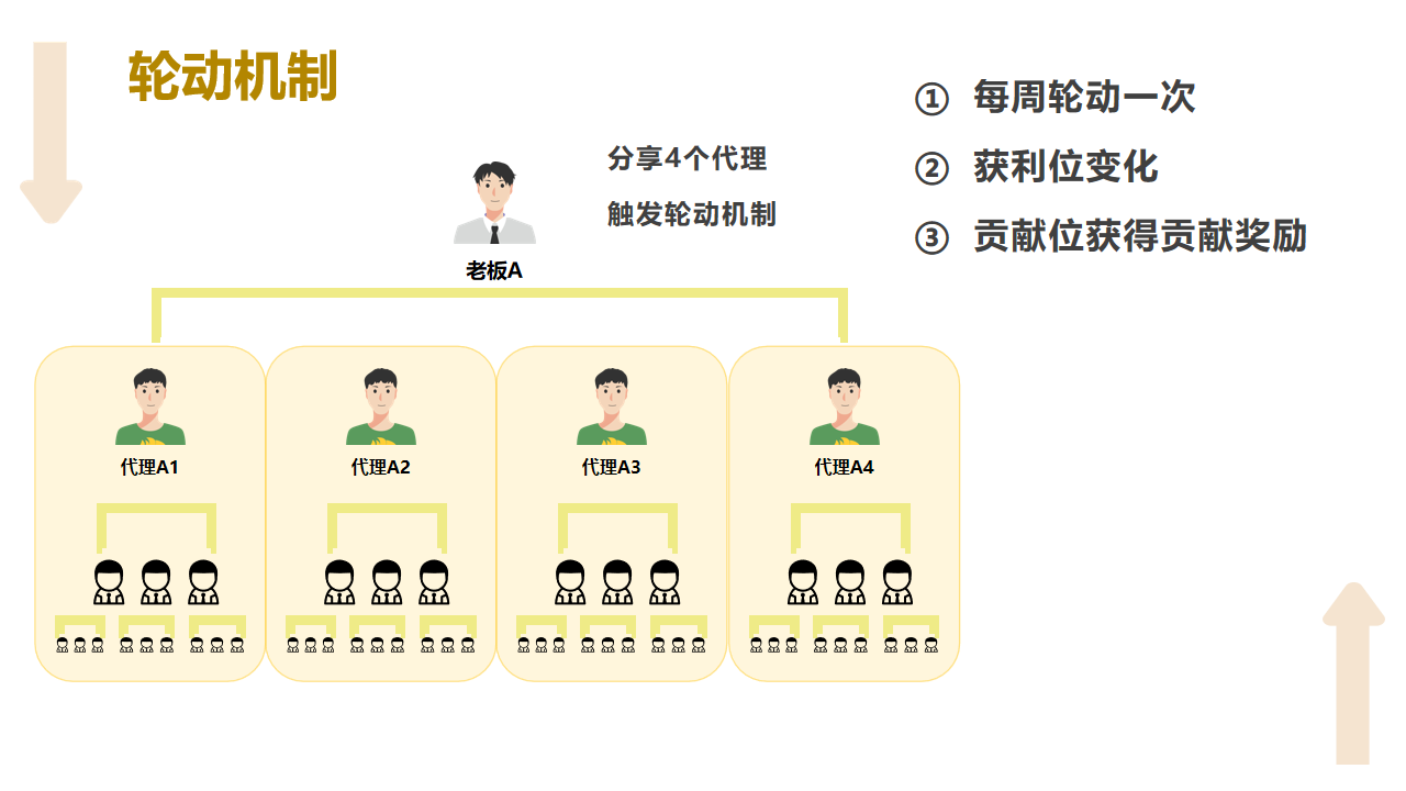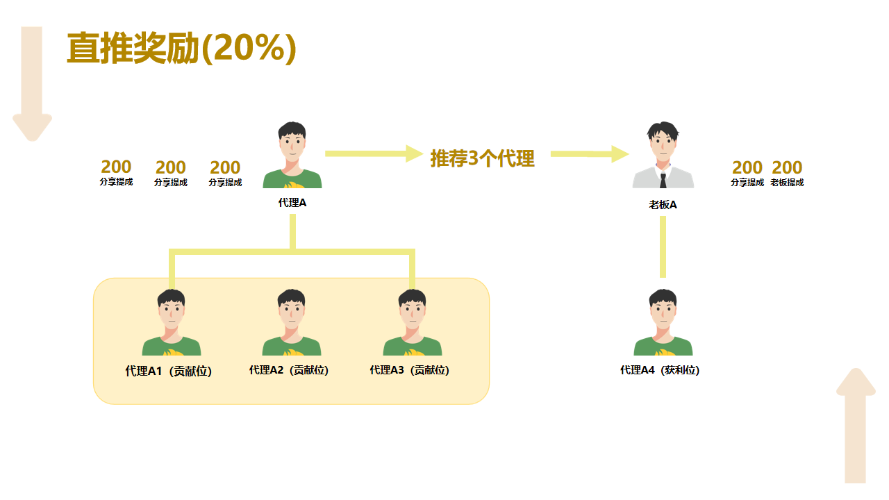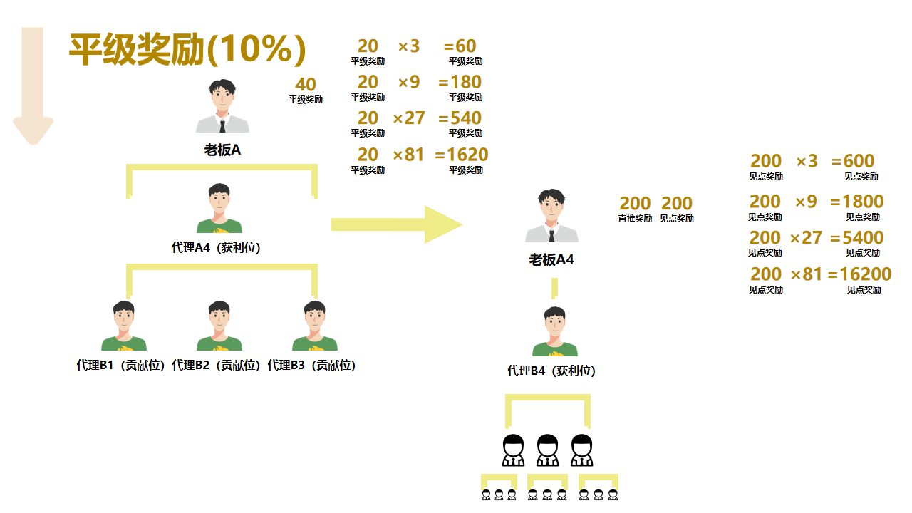 5.平级奖励(10%):下级升级成老板后,上级能拿他收益的 10%。比如下级每月赚 1 万,上级能拿 1000 元,鼓励老带新、传经验。