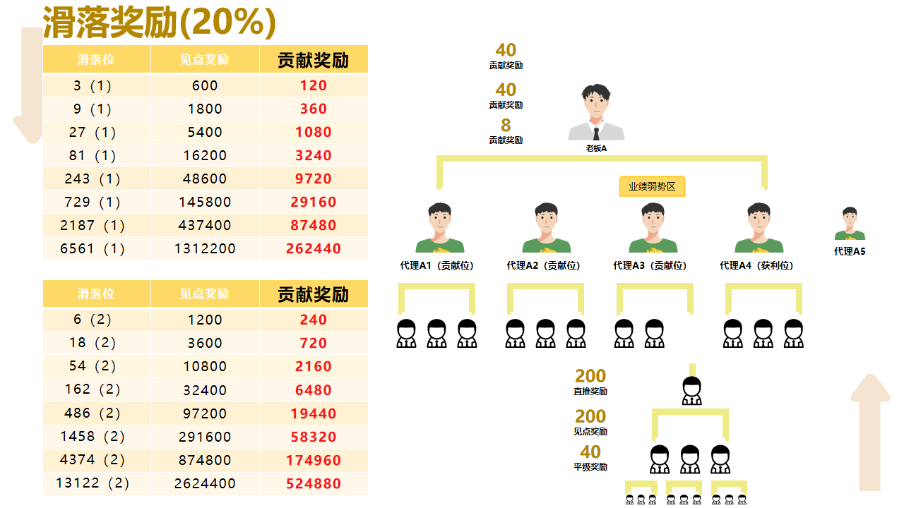 4.滑落奖励(20%):滑落到自己区域的新成员,每来 1 个都有分成。3 个人时拿 120 元,6 个人时拿 240 元,最高能到 52 万 +,让底层成员也能从团队扩张中受益。