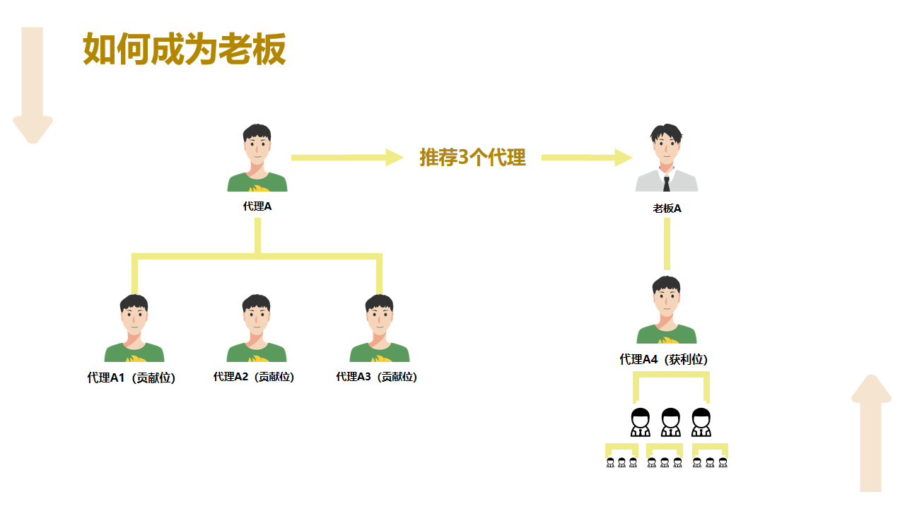 老板:代理推荐 3 个新代理,就能升级成老板,解锁更多团队奖励。