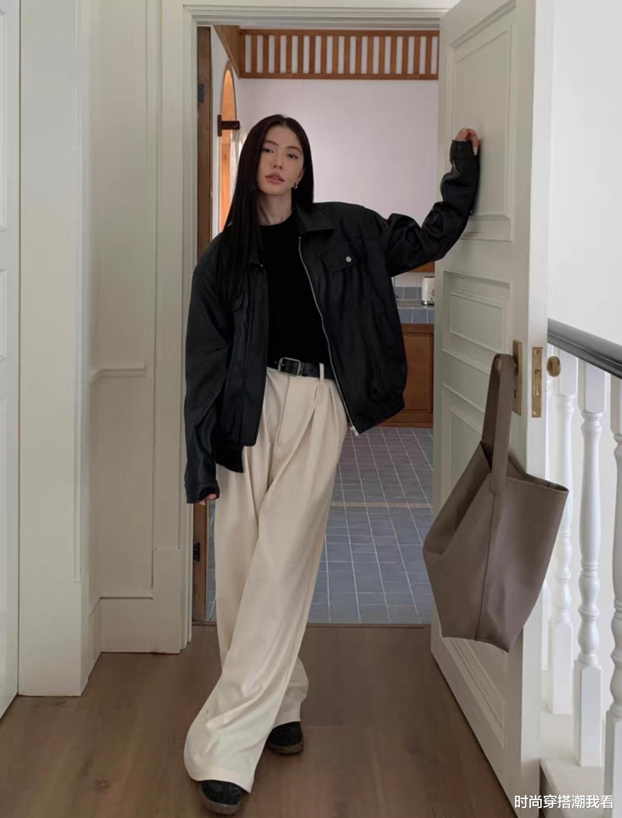 黑色皮衣搭配白色阔腿裤,能够穿出中性又帅气的感觉,整体造型随性不羁,非常适合追求个性的女生。