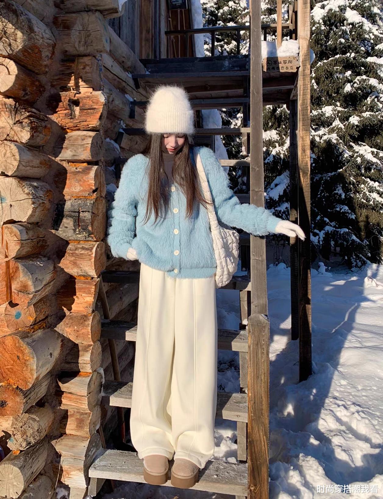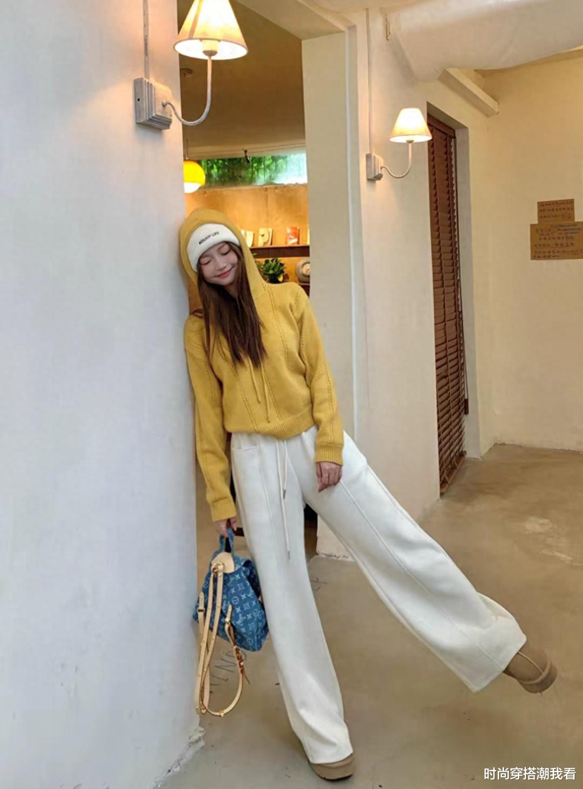 毛衣是冬季的必备单品,搭配白色阔腿裤能够轻松营造出慵懒又温暖的氛围。